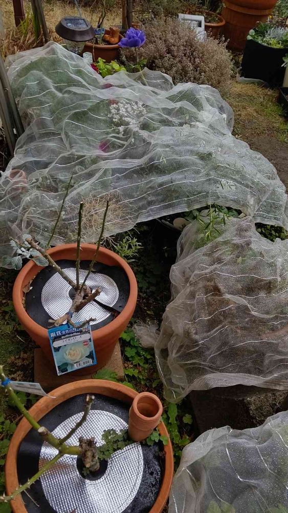 我が家のエリアは雪予報は出ていませんが、最低気温は今までになく低そうなので、気休め程度ですが寒冷紗をかけてみました。これだけニュースで脅されるとさすがに心配になり。😅