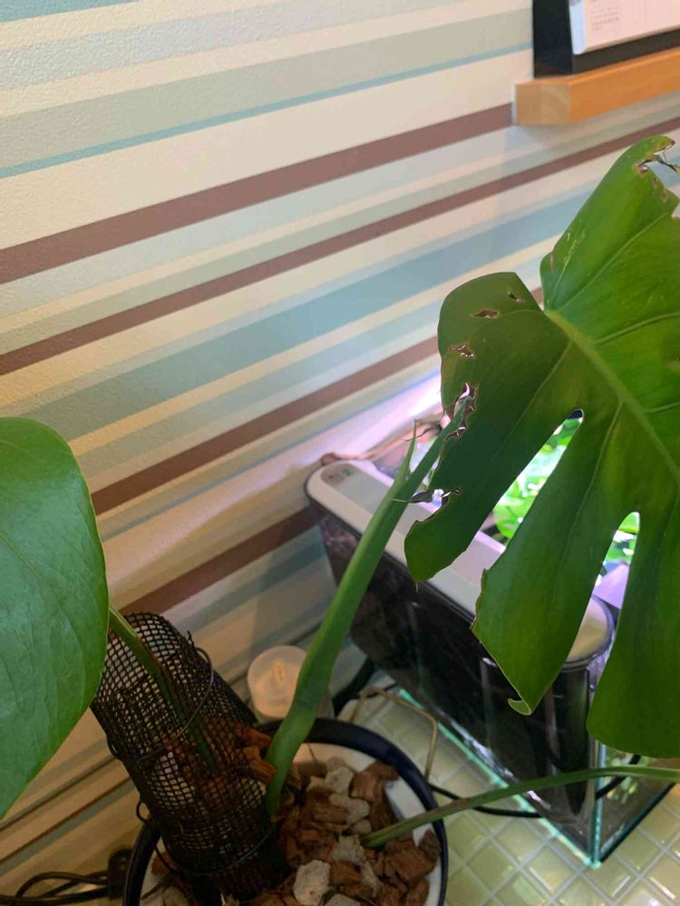 買ってきて速攻で猫にボロボロにされたモンステラにドリルが出てきました☺️