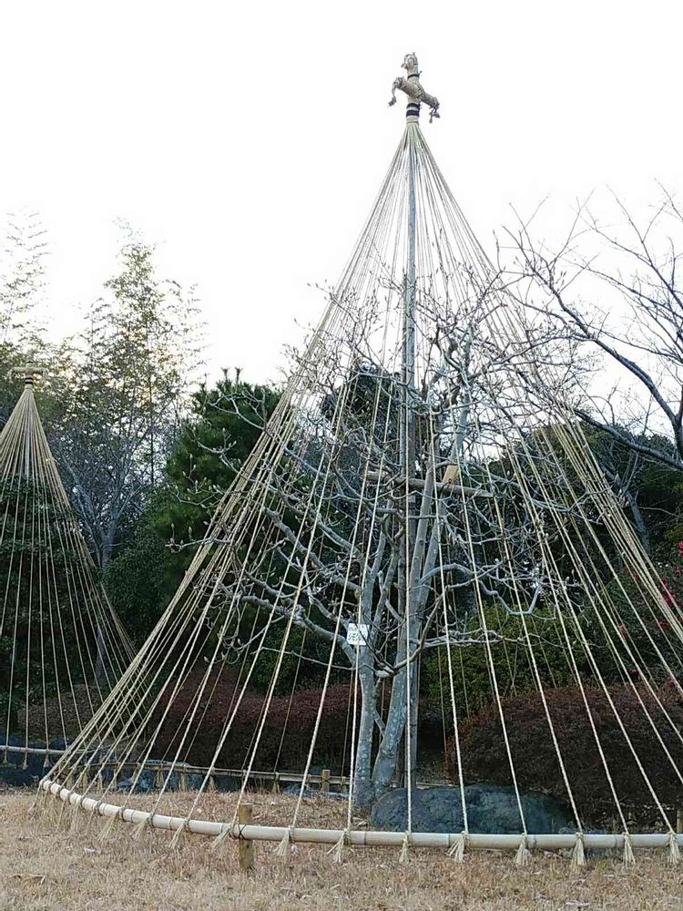 縄や針金で枝を吊って、雪の重みで、樹木の枝が折れないようにするためですが、あまり、雪が沢山降る地域ではないので、観賞用のようです。