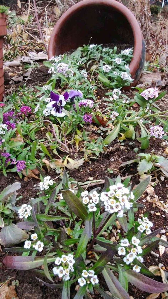大きな瓶から、飛び出て来たアリッサム、素敵なアイデアにさすがだなあと感心しています💕