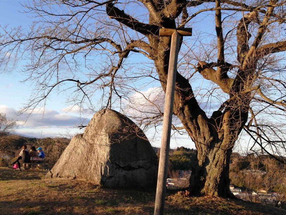 ベンチと石と桜の古木