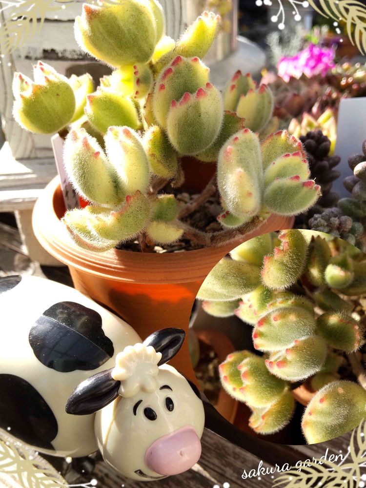 熊童子錦さん、ぷくぷくでかわいいですね❣️うちのは痩せっぽちです💦お外管理なんですね( ⋅֊⋅ ).ᐟ.ᐟ寒さに弱いと思ってました〜牛さんが見守ってくれてますね❣️