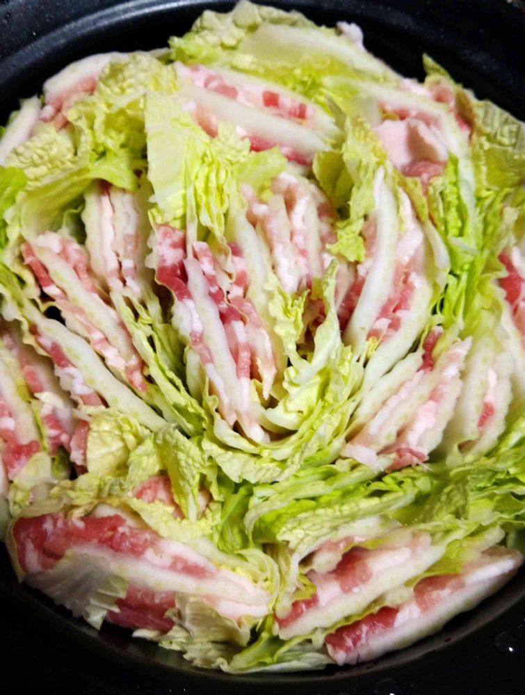 白菜に豚バラ乗せたら白菜は茎の方と葉っぱの方と互い違いにおいてね🐽