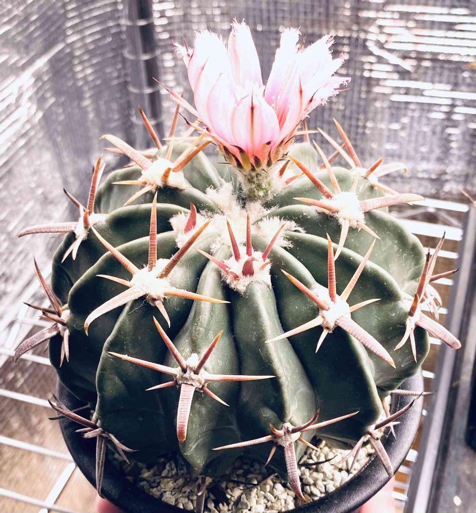 ホマロケファラ・王綾波。室内LED環境で昼暖かく、夜冷えるのが成長期の環境と近しいものになったようで、花を咲かせて新刺を出してます☺️