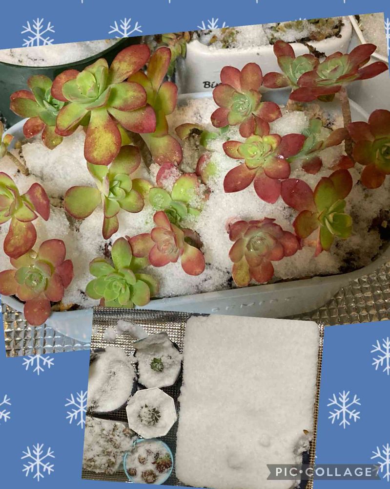 多肉棚に入りきらず、軒下避難組の薄化粧とセンペル達、雪が吹き込んでアッという間に真っ白💦