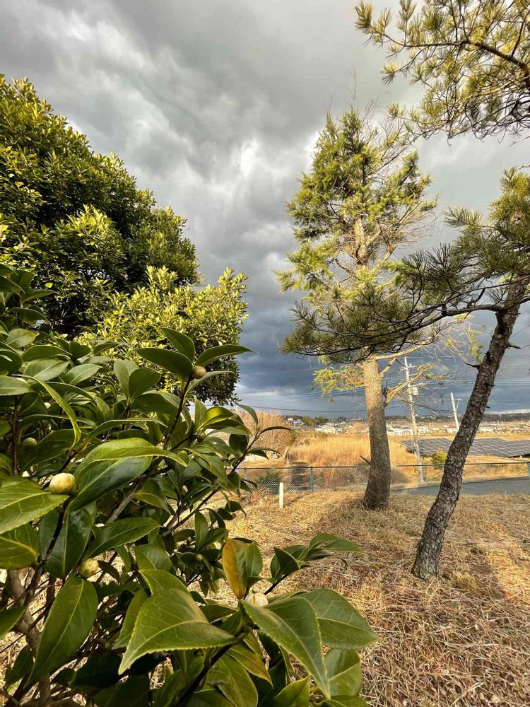 職場の乙女椿のつぼみちゃん〜まだまだお花は咲かないですが〜空の色が〜😱