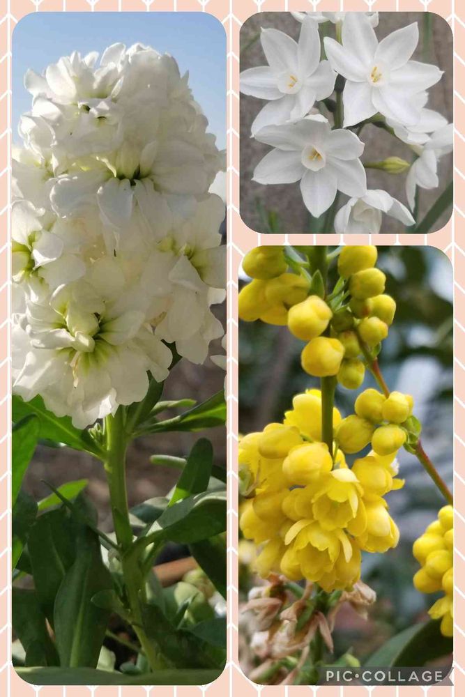 今日は寒すぎるので、白のお花だけだと寒々しいから、黄色💛のヒイラギナンテン チャリティーも💕