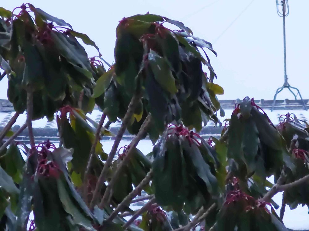 様子がおかしいと思ったら、寒波の風に吹かれたままの形で凍ってた💦💦