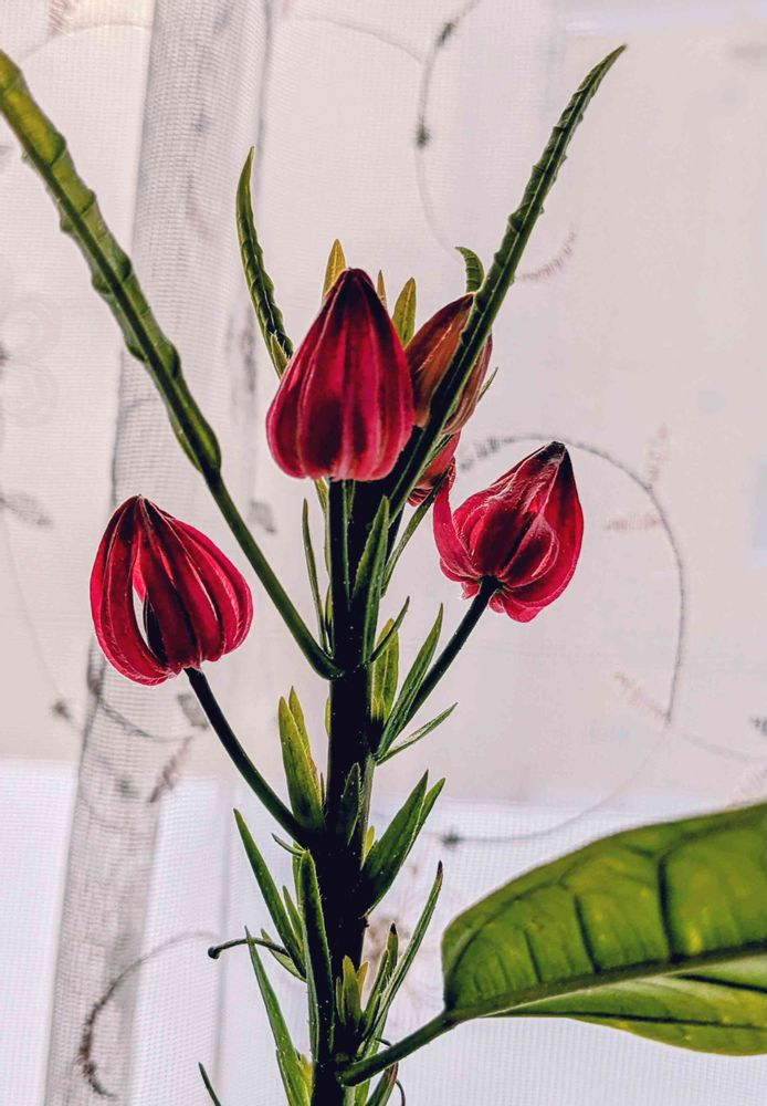 赤くて可愛い花ストーブ付けて寝てるので季節感間違えたのかツボミのまま開かないです♡
