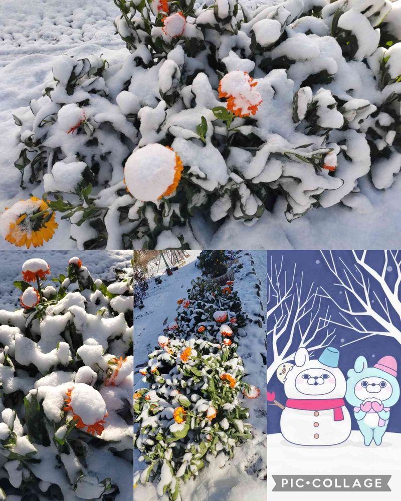 キンセンカに雪⛄が積もり、重いよ~😭って言っているみたいです🤗今日は、朝から☀晴れて道路は少しづつ溶けてます。まだまだ降り続いてる所の皆さん!気をつけてお過ごし下さいね🥰。