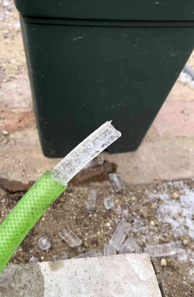 庭に出てみると防寒してても冷気が痛い。そして庭のホース、蛇口ひねるとにゅーっと氷が出てくる🥶昨日から蛇口チョロチョロ水出してたんだけどホースの中で凍ってた