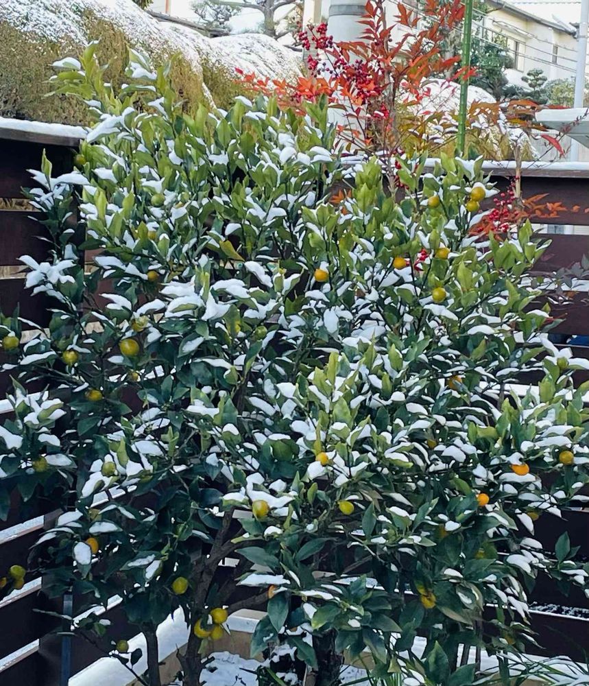 実が色付いてきた金柑も雪化粧、南天の赤色もとても映えます