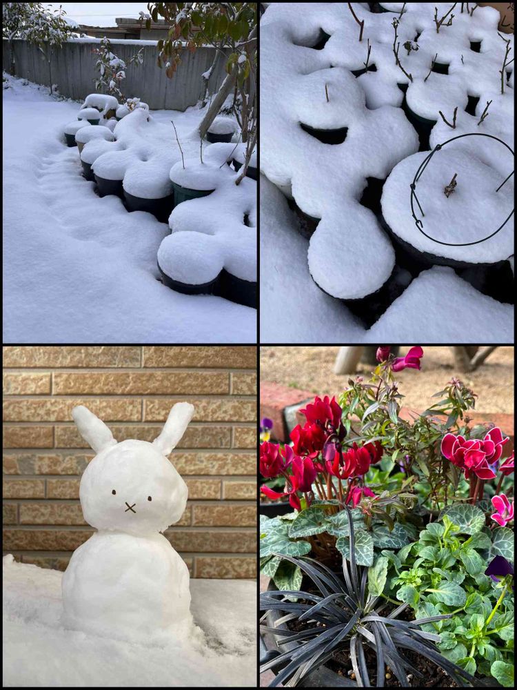 ウサギ可愛いい〜やっぱり,雪だるまにも,個性が、でますね^_^今日,軍手をはめて,鉢の植物の,雪だけは,払いました。種蒔きしてたクロタネソウの幼苗の雪払ったら、,一緒に取れてちぎれてしまいました( i _ i )