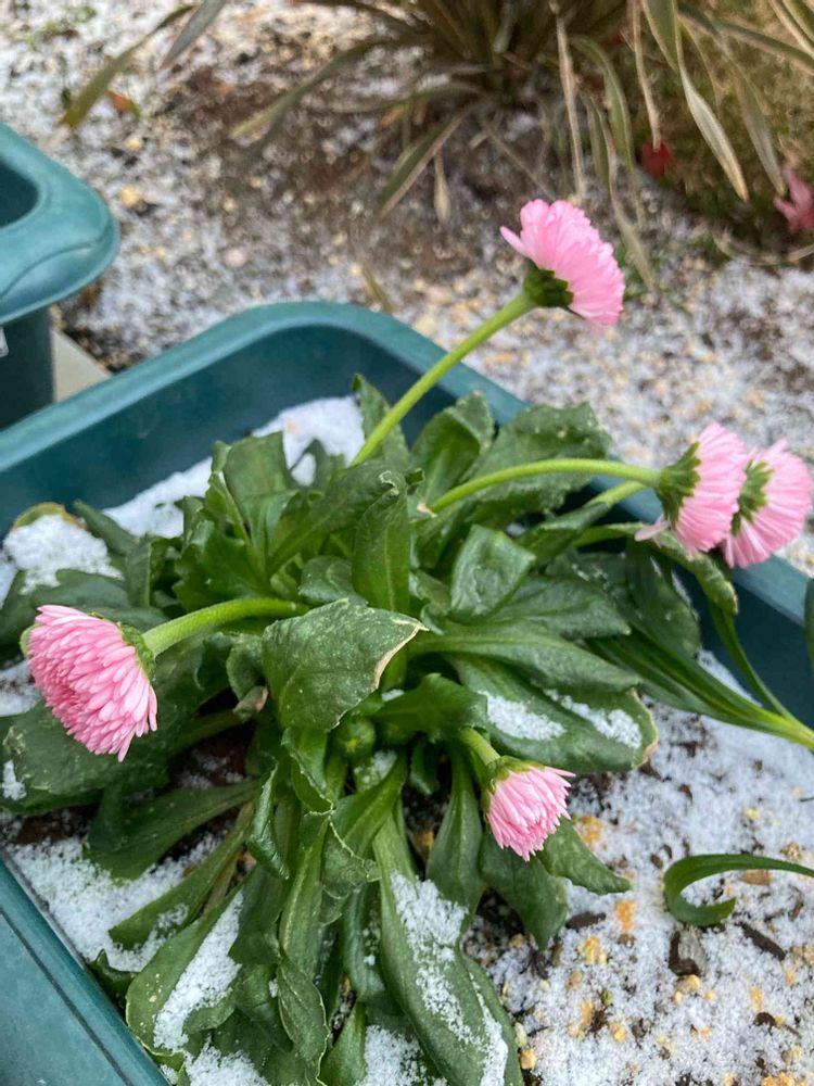 ちょうど開花してきているチロリアンデージーも、朝方の零下6度にはうつむき加減に、、。