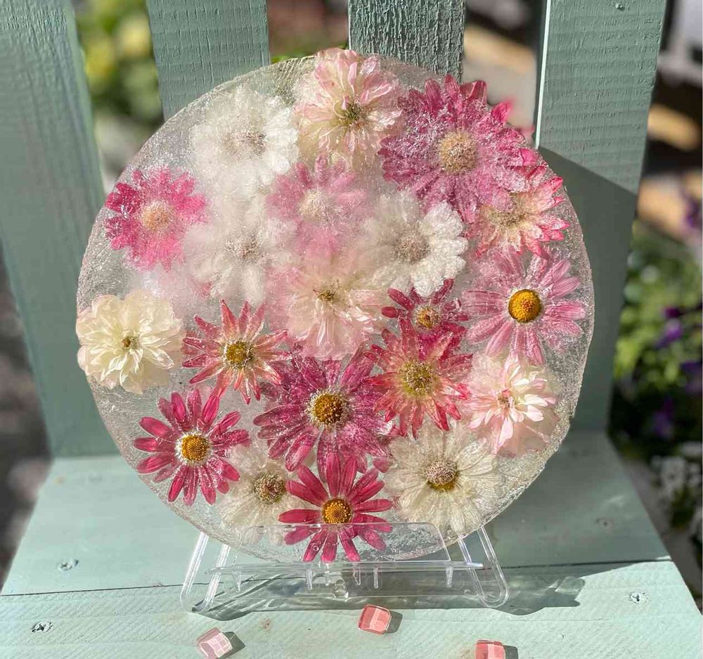 …で、我が家で今満開のマーガレット嬢や、ミニバラのグリーンアイス嬢にご出演願って、氷アートに参加していただきました🖼✨しっかり凍りました🧊