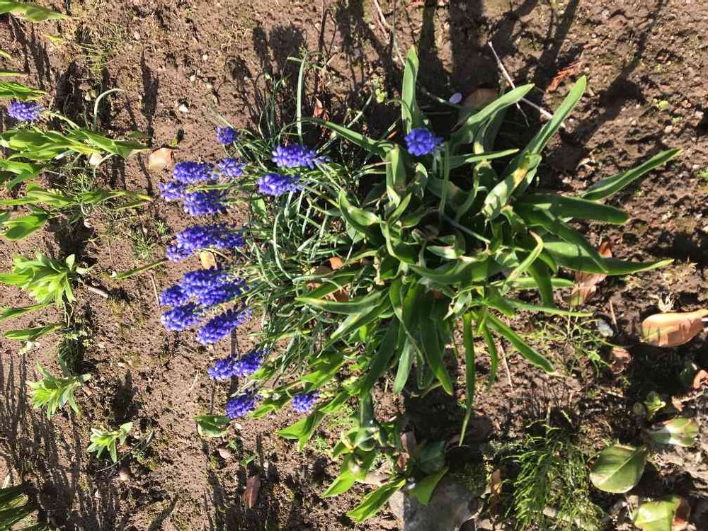 ◉ ルリムスカリは球根植物で、球根からふつう2~5個の葉と花茎が出ます。 花は茎の頂部にツボ形の小花が集まり密集して咲き、外観が「ブドウの房」に似る事から種小名の由来にもなっています。 花は頂部だけ不稔性(種を作らない)で、下部の稔性の花と比べて色が薄く上向きに開花する傾向にあります。