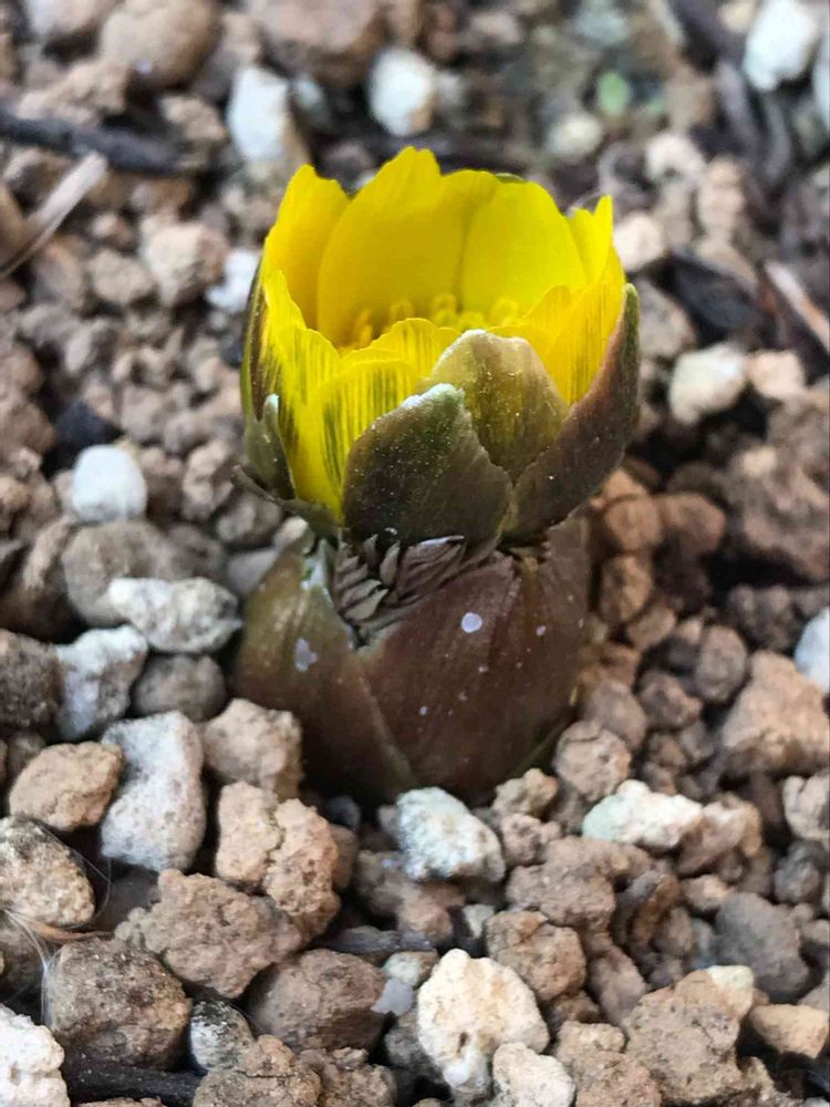 園芸もやっています派です。先日の春を待つシリーズで芽出しをアップしましたがなんとこの寒波にめげず開花して来ました。もちろん外置きです。ちなみに昨日の朝はマイナス5℃まで下がりましたが昼にはご覧のように開花が進みました(午後は8℃)。誰かさんのようにコタツに入って動かないのとは違います。茎は伸ばさず、葉も広げていませんが花はしっかり開花モードです。