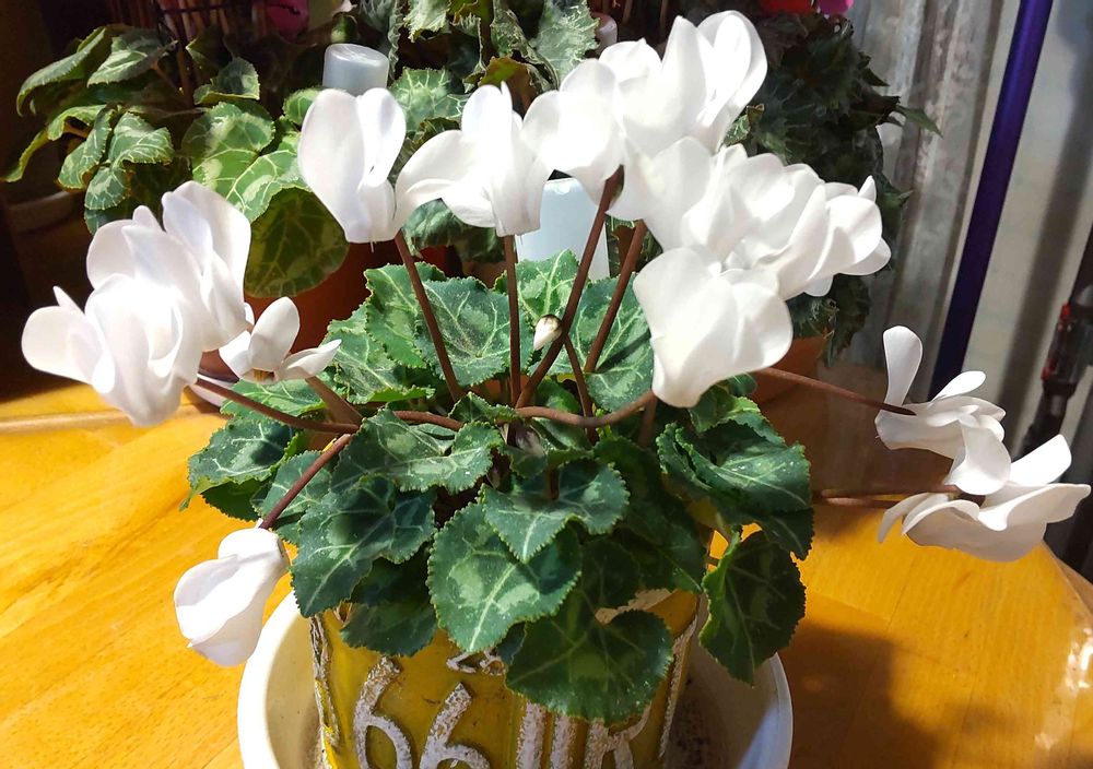 玄関の寒さでお花がダラ〜ンと垂れ下がっちゃってたので、居間に移動させてまさに復活中のシクラメン🤍