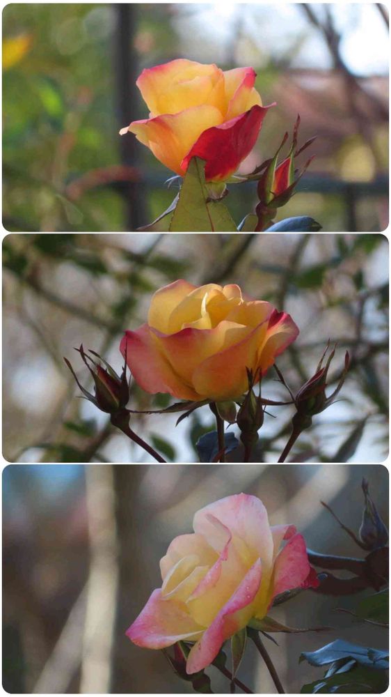 バラ プレイボーイが三者三様の可愛い顔で咲いていました。