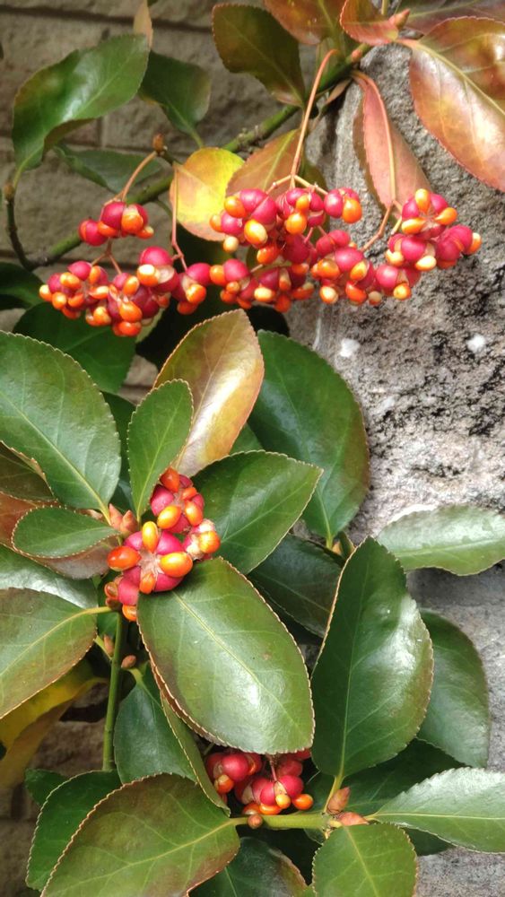 マサキ(正木)の実は 蒴果(さくか)で 弾けると中からオレンジ色の仮種皮に包まれた種が覗きます。