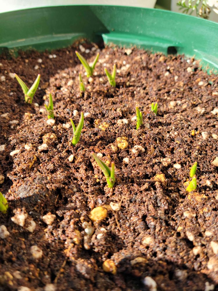 年末の大掃除で発見して植え付けた球根が🌱を出しました。