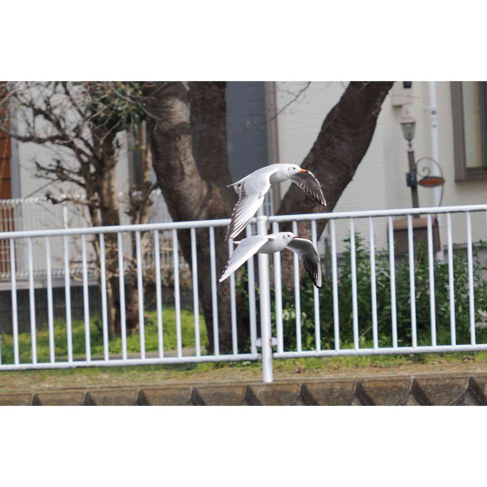 いつもの川縁の遊歩道を歩いていると前からユリカモメが数羽こちらに向かって飛んできます。
