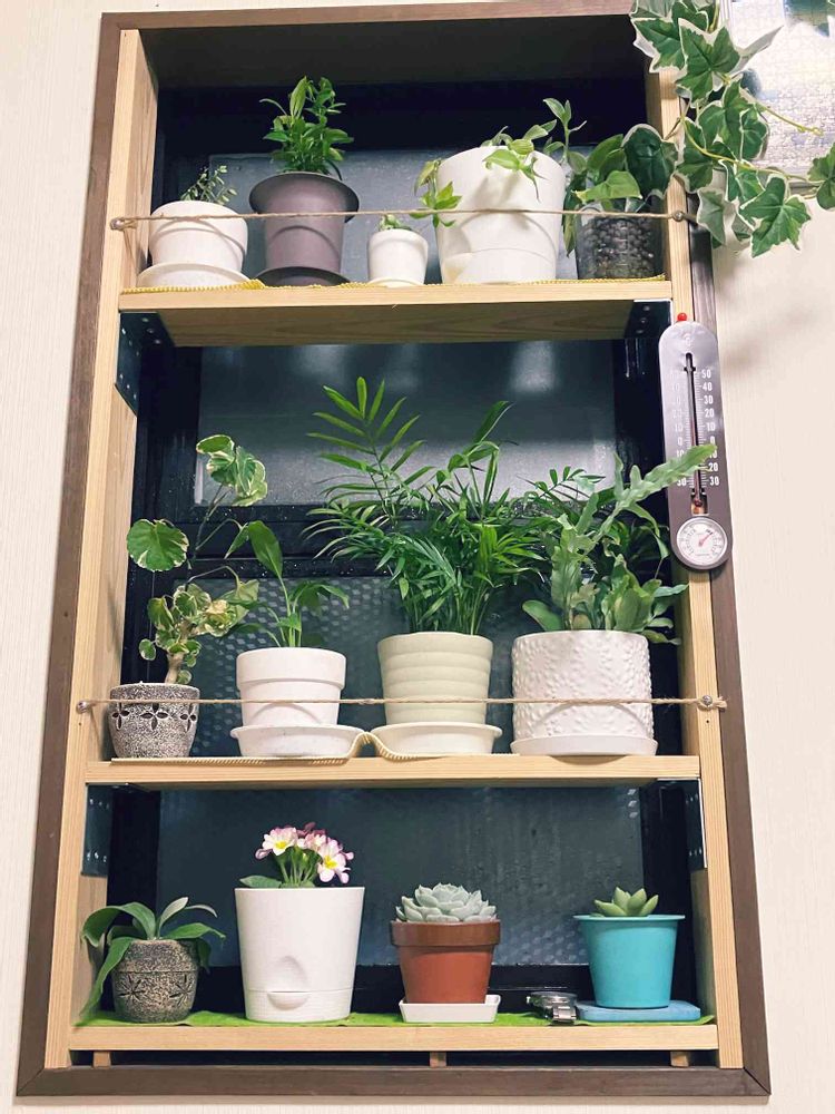 去年アップした窓枠を利用して作った棚の現在。ちょうど1年ぶりの登場。