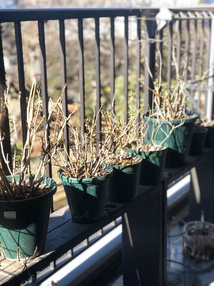 普段はサボテンを置いている棚は冬の間だけ紫陽花を置いて日に当ています。