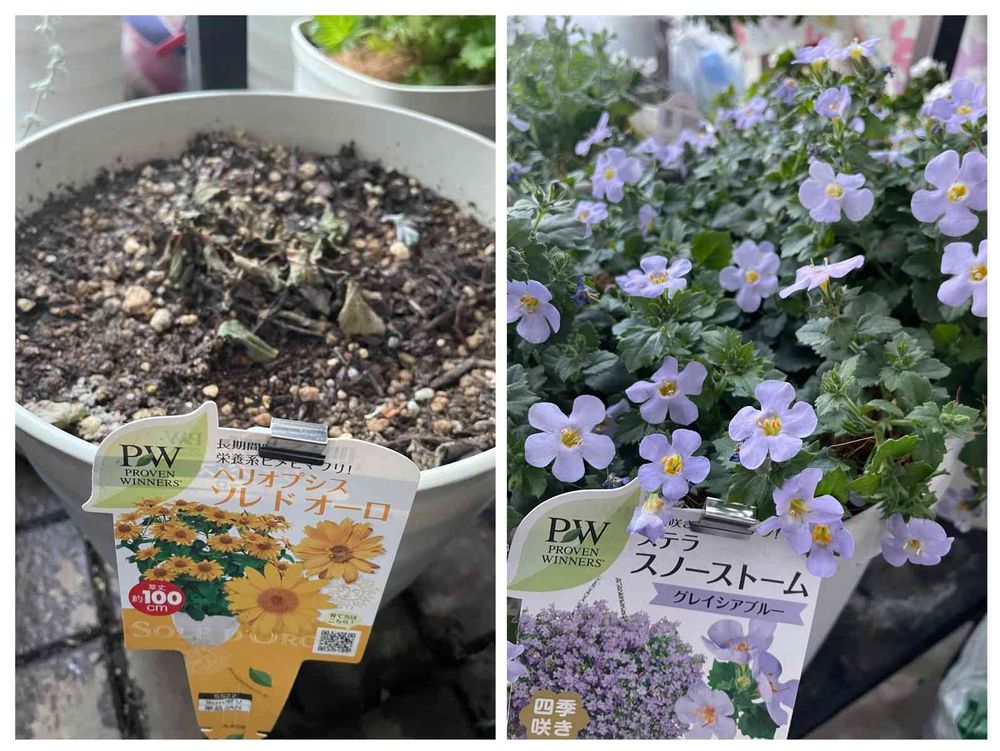 pwアンバサダー苗の3ヶ月後の様子です。今回の寒波でヘリオプシスソレドオーロは完全に地上部は枯れてしまいました〜なんとか春に芽吹いてくれるのを期待します。🙏一方でステラスノーストームグレイシアブルーは頑張って花を咲かせてくれます💕
