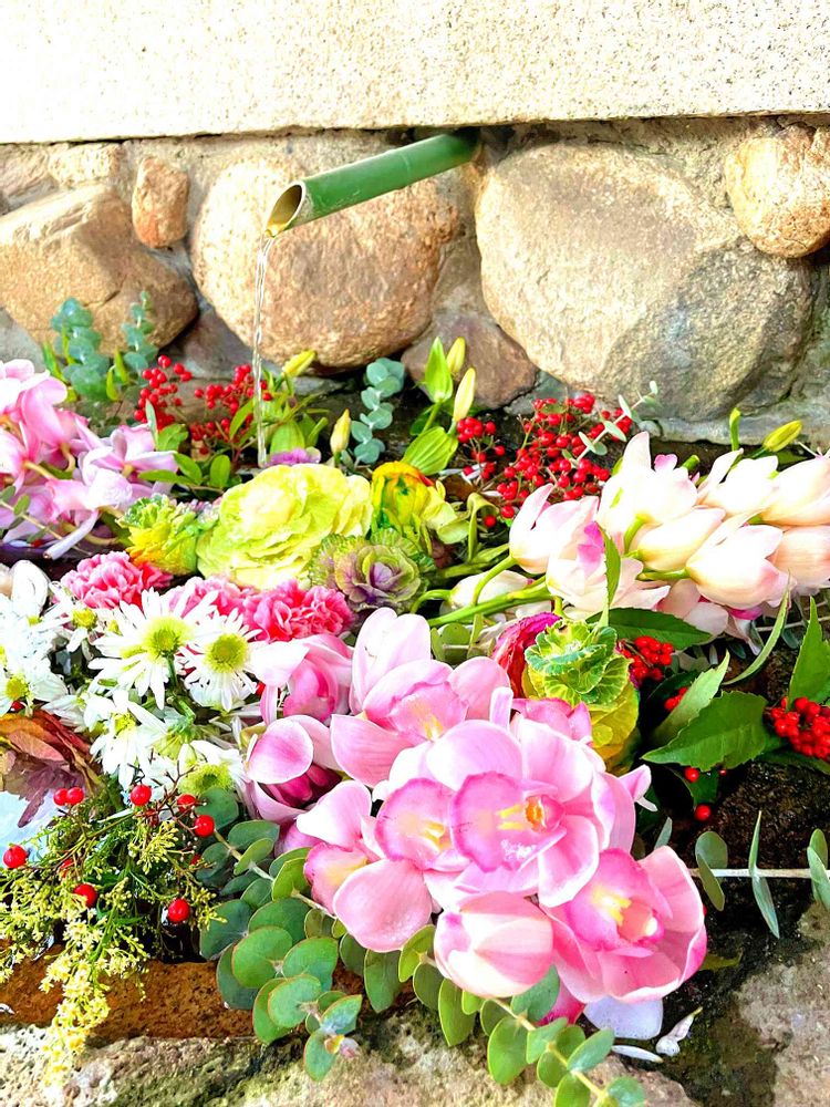 冬から春への季節の移ろいを表しているような素敵な花手水を見せてもらえました😊