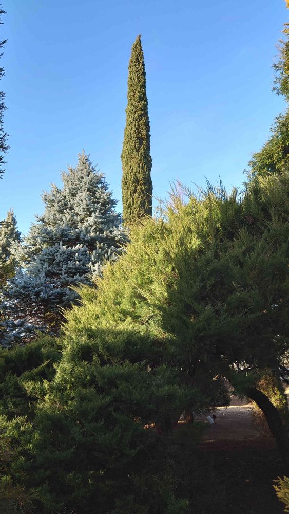 コロラドトウヒ(奥から2番目)の奥には、またまた登場のとんがったヤツ、ニョッキーです🤣 このフォトにお題をつけるとしたら「青天を衝け」でどうどしょうか😀 どこかで聞いたことがあるなぁ🤔 お許しを🤫🙏🙇💃 それにしてもとんがってるなぁ🤣(農業試験場内にて)