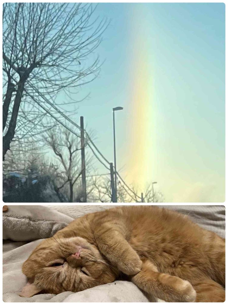 今朝の冷え込みで、虹色のサンピラーが見られました🌈