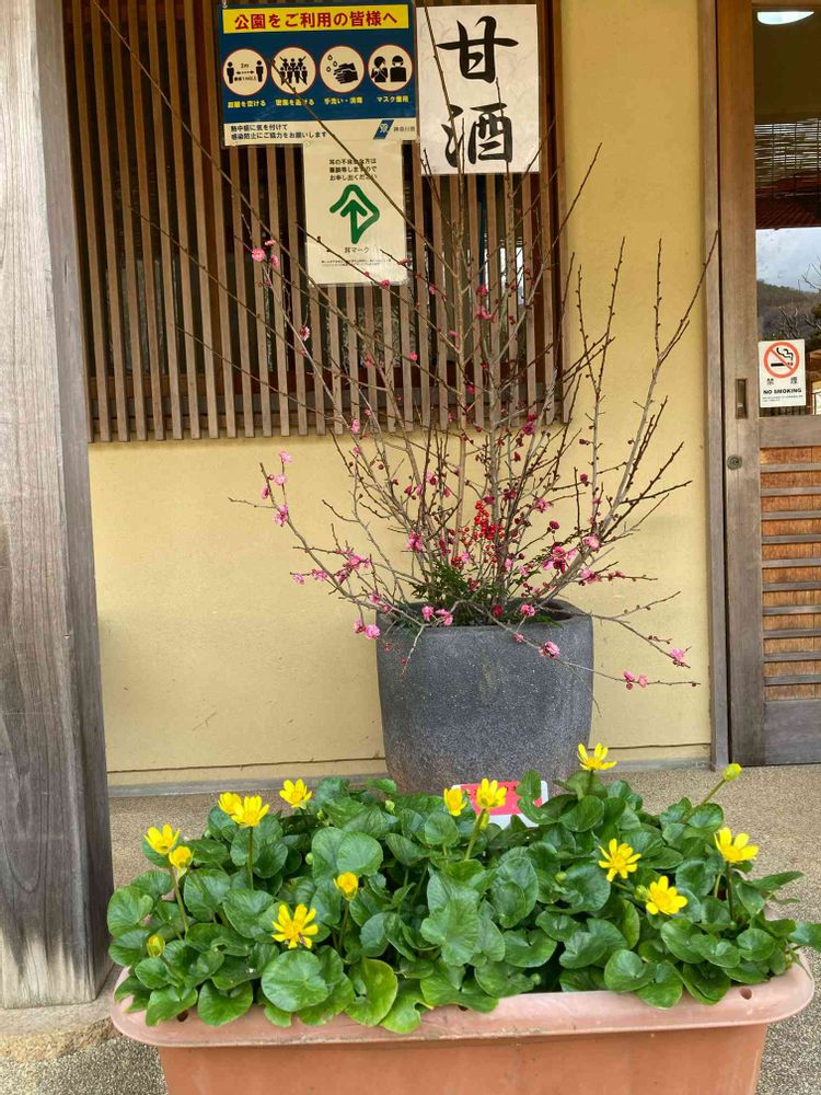 戸川公園の茶室の入り口に飾られてるヒメリュウキンカと梅❣️
