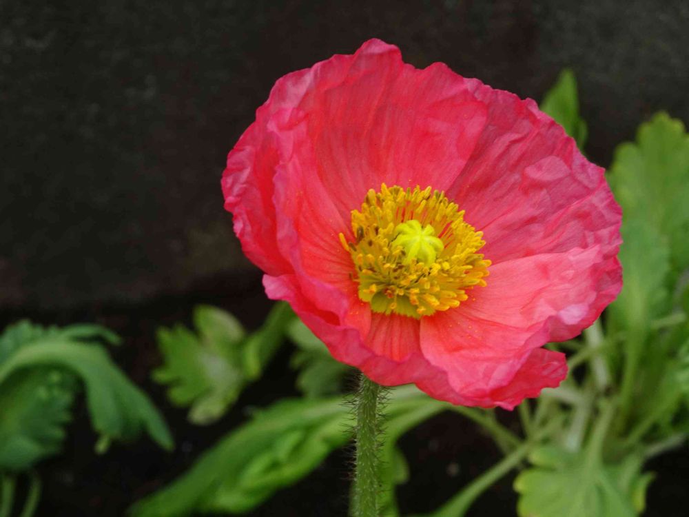 ヒナゲシは茎を分枝させて花を咲かせるのに対して、アイスランドポピーの茎は分枝せず、一本の茎に一輪の花が咲きます。また、ヒナゲシには伸びた茎に葉が付きますが、アイスランドポピーは分枝せずに株元から茎を伸ばすため、茎に葉がありません。