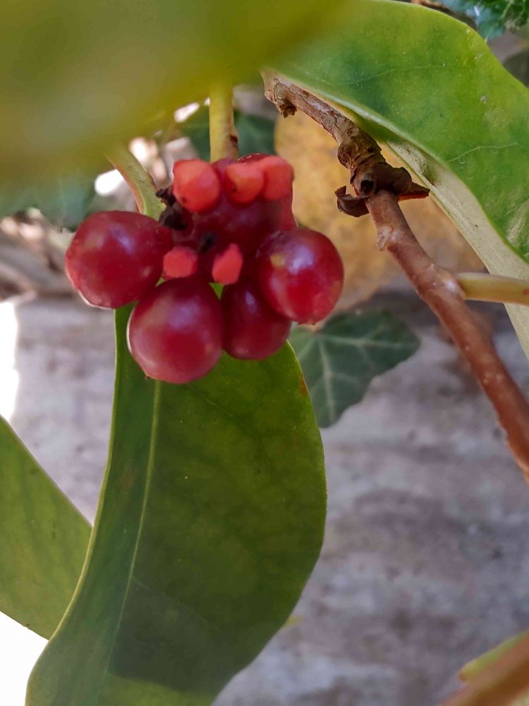 今回も実が付いていないと思い込んで葉を撮っていたら、奥の方に赤い実が見えました。