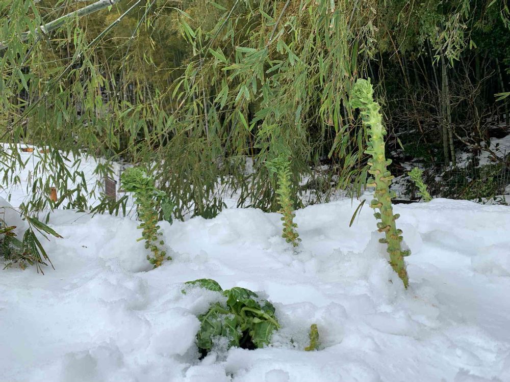 やっと雪☃️も落ち着いたので雪かきして畑の様子を、、、ギャー😱❗️芽キャベツが丸裸🤣💦ヒヨドリの仕業と思われます🥲孟宗竹も雪☃️の重みで倒れてきてるし💦また椎茸の様子も見に行かなきゃ😅💦