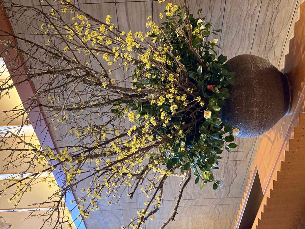 こんにちは😊ホテルロビーにて、石草流奥平清鳳先生作。サンシュユ、椿、苔梅。たおやかな雰囲気、リズム感溢れて、とても素敵です✨✨✨