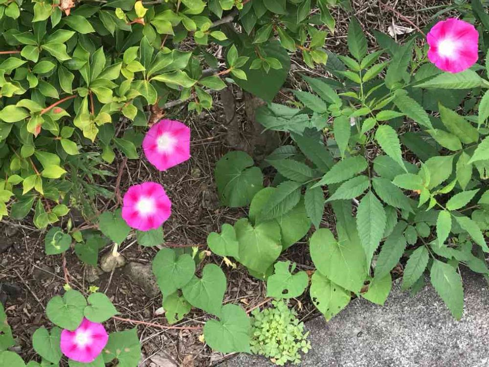 ◉ いわゆるアサガオのひとつで、国内には1700年代に観賞用として渡来しました。 定番種のアサガオの葉が3つに裂けるのに対し、丸っこいハート形であることから、マルバアサガオと呼ばれています。 夏に直径8センチほどの紫色の花を次々と咲かせます。 花期が長く、初霜のたよりが聞こえるころまで咲き続けることもしばしばです。