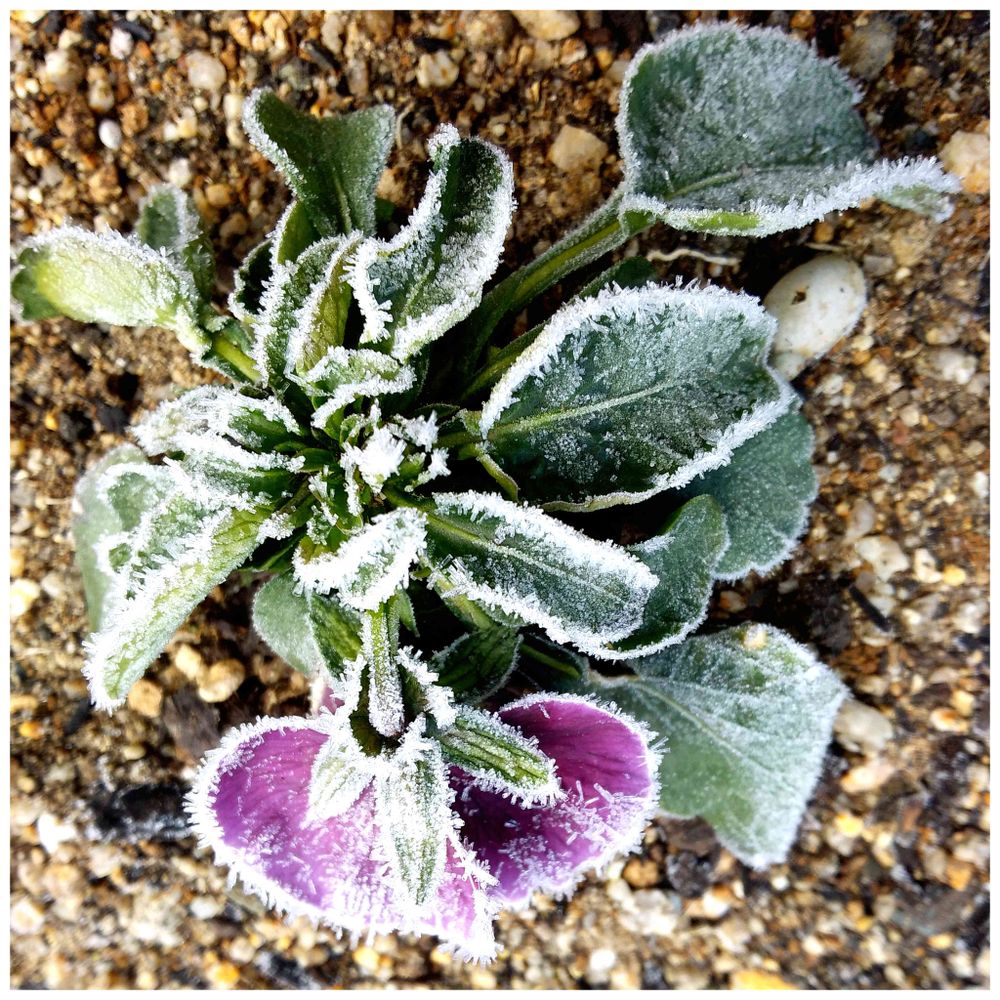 朝日が見え始めたのに、まだこのように凍えている『パンジー』です😵