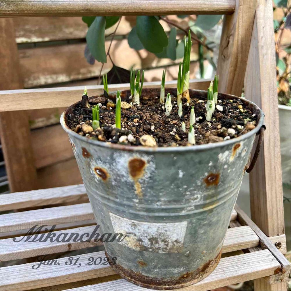懐かしいブリキのバケツに🪣クロッカスちゃんが芽を出して🌱🌱可愛いですねー💕💕