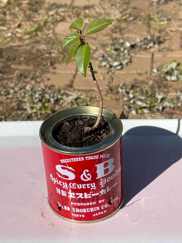 昔なら一家に一缶と言うくらいお馴染みのこの赤い缶に植え付けてみました。