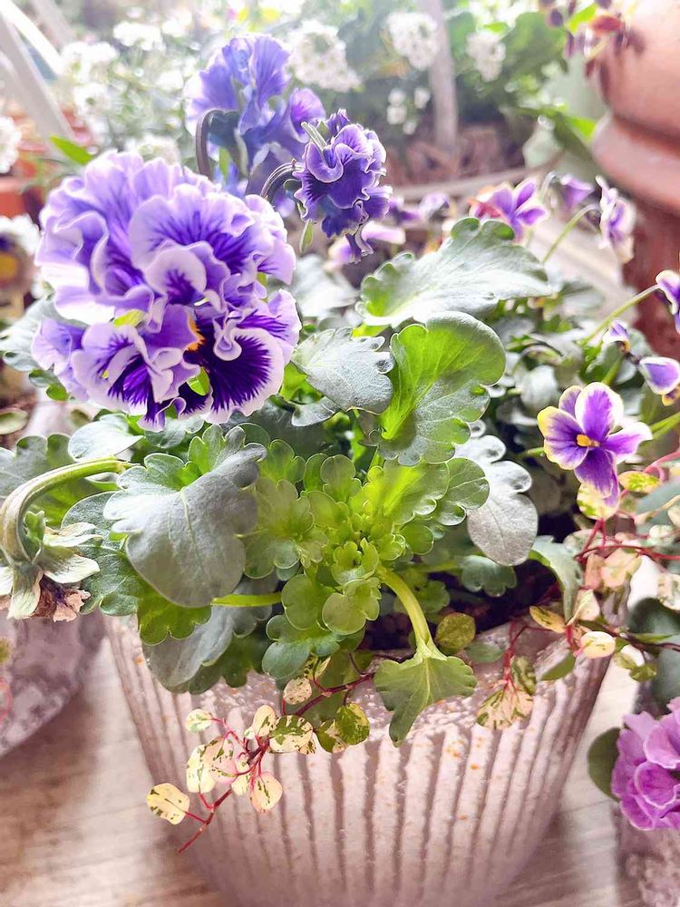 見事なビオラと鉢も素敵な寄せ植え。絵になります✨