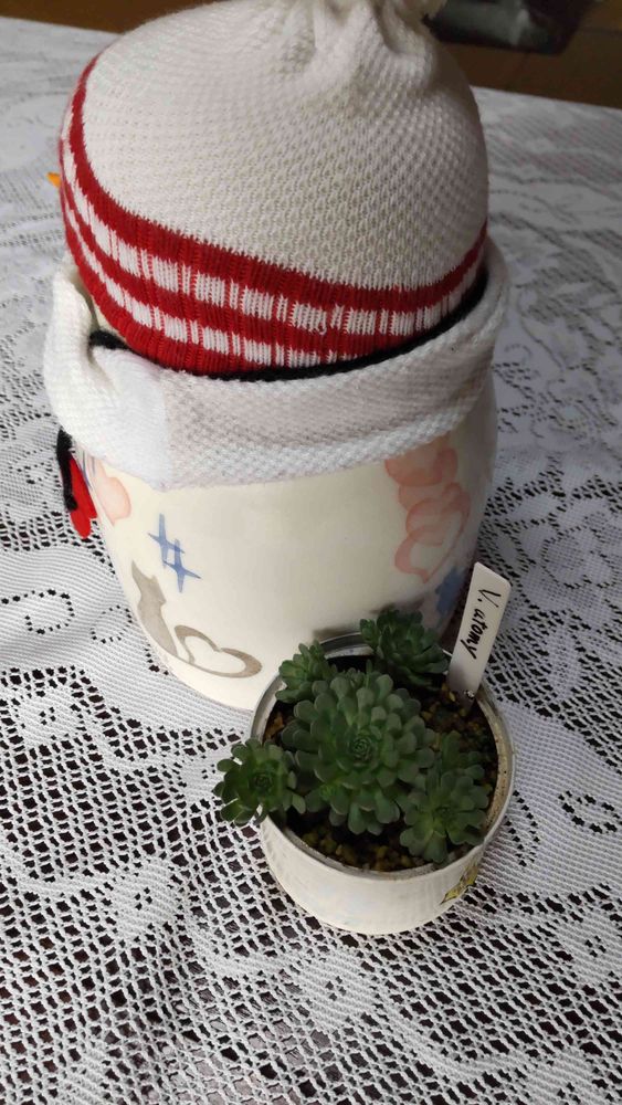ご近所さん作の陶器、私が勝手に目鼻や帽子とマフラーをつけてスノーマンにしてますが、ボディに描かれた猫ちゃんがかわいいの💕