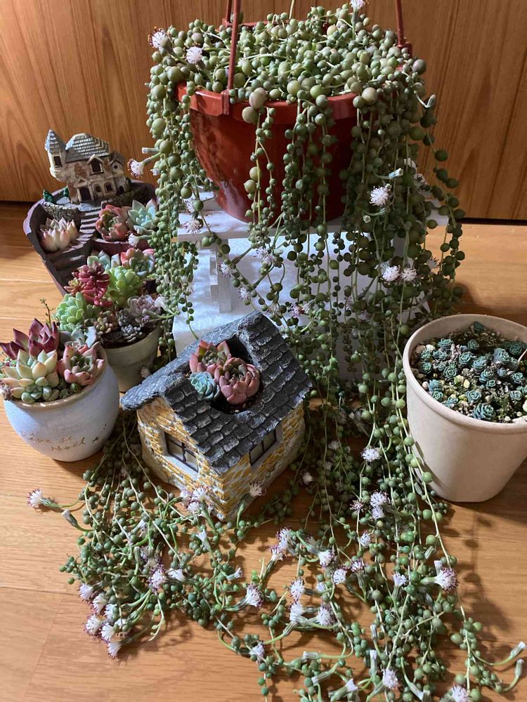寒波が来るということで、室内に入れて吊るしていたら、数週間で、グリーンネックレスの花が🌸🌼いっぱい咲きました。