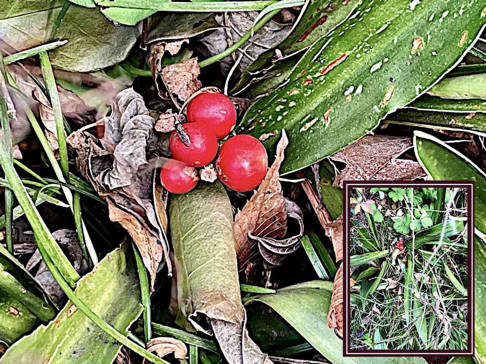 そこには、その草花の外観の風貌から、既に多年を経たようであるが、革質の分厚い針のような形の葉、まだ力一杯に根元から、そして、精一杯に赤い実をとどめようとして、4つの果実をまだしっかり付けているようであった。