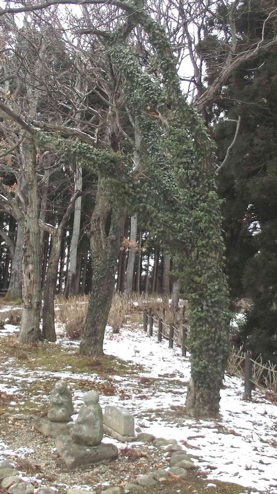 高村夫妻の石像と蔦の登った桜の古木です