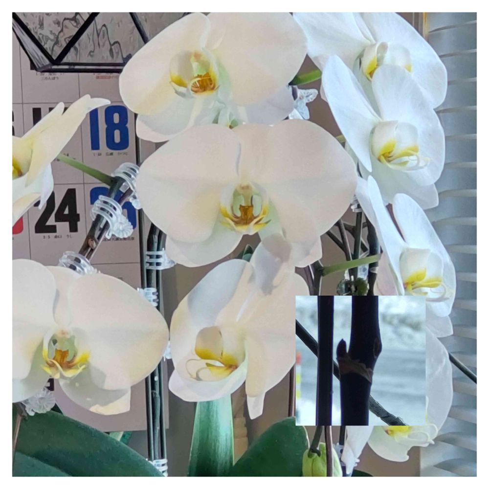 大輪白胡蝶蘭3番花と4番目花が満開です。一昨年の花芽が1番花を咲かせてるときに2番花の花芽がハカマから伸びて去年の冬からずっと最低いて、その時にはすでに多く下のハカマから花芽が頭をだしていて…それが今開花してます✨そして小さな写真のアップのようにまたハカマから花芽が頭を下げだしています😳いやいや💦パワーあり過ぎでしょ‼️連続開花更新中😅