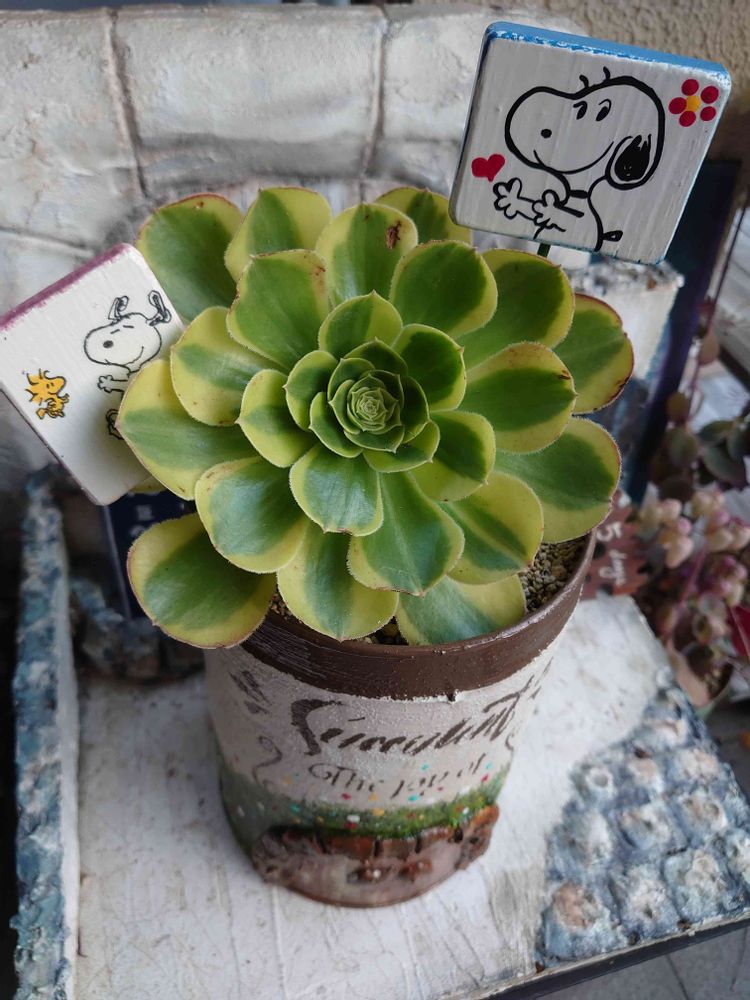 素敵なトワちゃんの素敵なリメ缶に植えてくれて、素敵なみたりんちゃんの可愛いスヌピック差して、アエオさんも幸せだわ☺💞