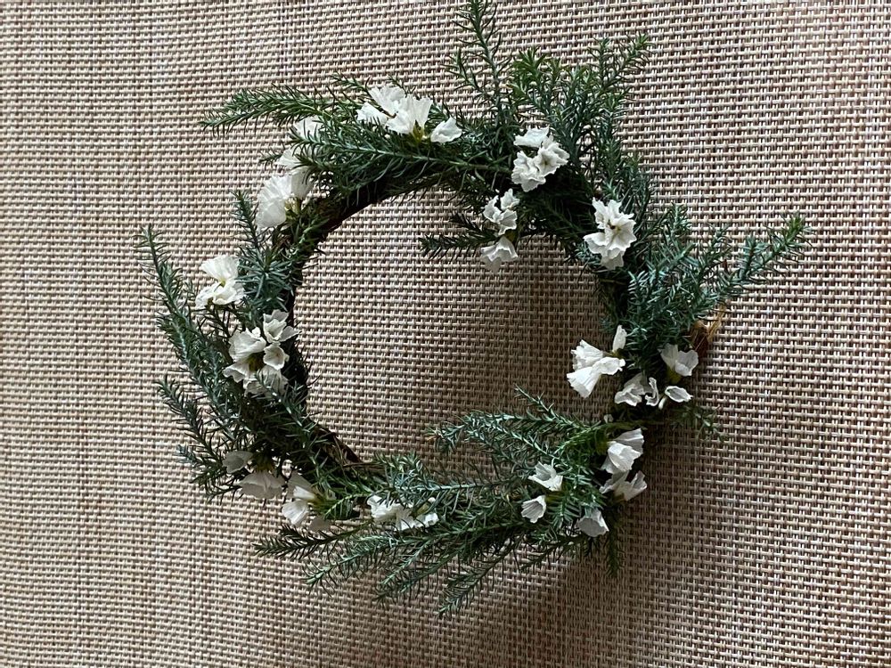 白いスターチスと、庭の冬(クリスマスに、リースにしました)のグリーンで、リースにしたのですが、このグリーンの名前、教えてください😌