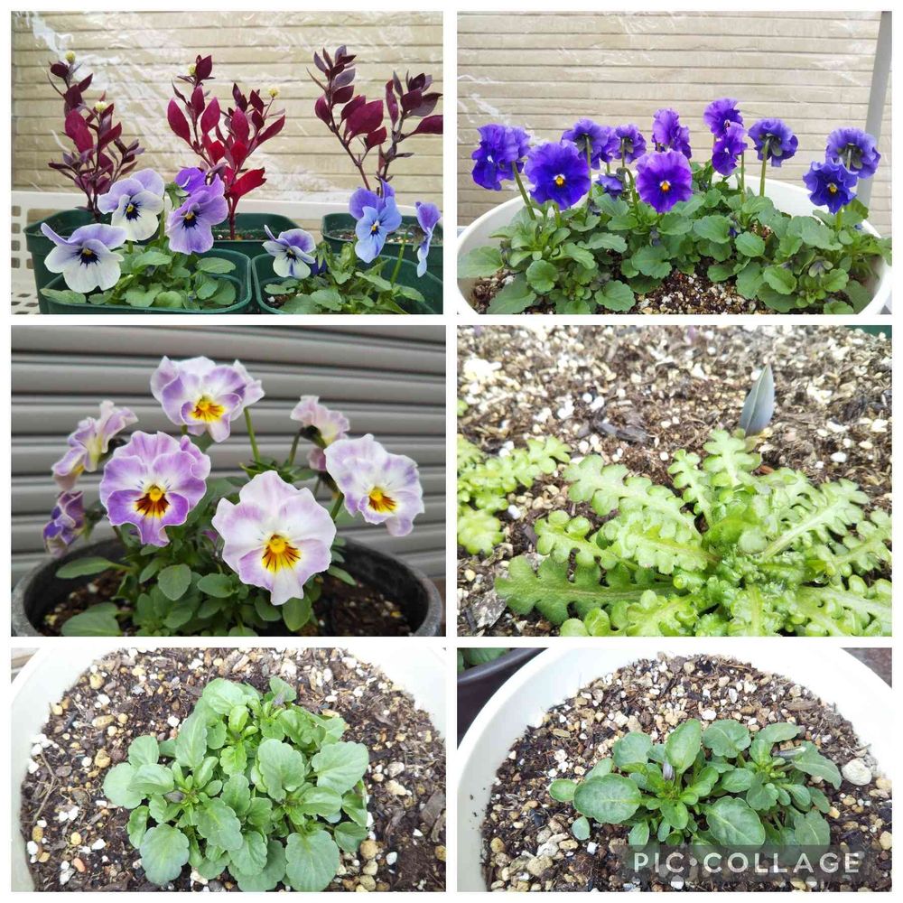上左、10月末に蒔いた自家採種からのビオラ・ラベンダーマジック。後ろは秋に挿したアルテラナンテラ。